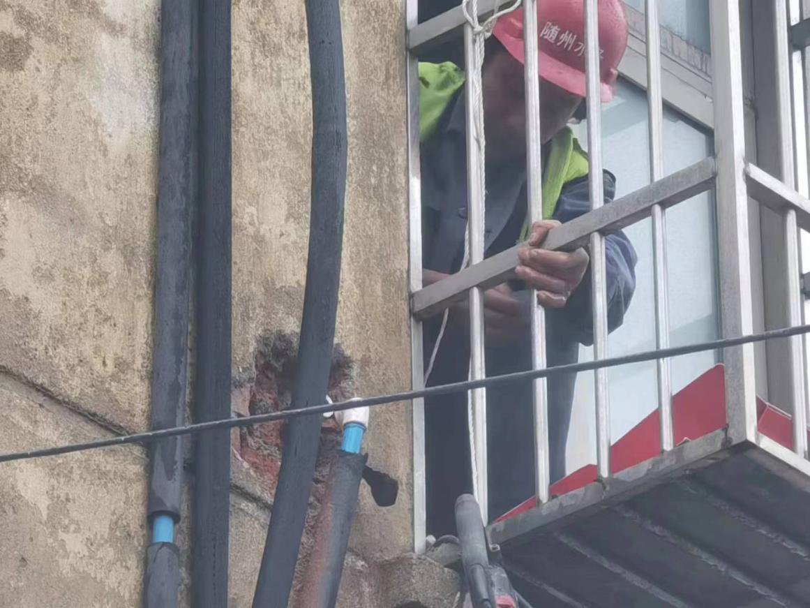 “這里水管漏了,外面的墻都打濕了,麻煩你們快來看看啊!”3月20日上午8點(diǎn)30分,建設(shè)工程公司接到市民的求助電話,稱他家墻外有根水管在向外冒水。運(yùn)維中心牽頭人張遠(yuǎn)燈立即安排維修人員第一時(shí)間趕往現(xiàn)場(chǎng)。經(jīng)過詢問和現(xiàn)場(chǎng)查看后,發(fā)現(xiàn)事故原因是2樓外墻進(jìn)屋處彎頭漏水,但該項(xiàng)維修內(nèi)容本不屬于公司的維修范疇。維修人員看到無助的老人,便毫不猶豫地爬上2樓陽臺(tái),在狹窄的空間內(nèi)艱難地為老人更換破損管件。雖然是用戶房屋內(nèi)部管道漏水,水務(wù)人本著想用戶所想,急用戶所急的服務(wù)精神,不計(jì)較、不推諉的幫助用戶及時(shí)解決漏水難題。