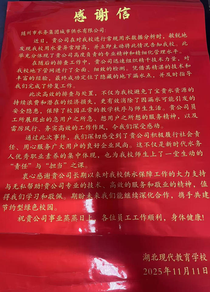 一面鐫刻著“明察秋毫堵漏點(diǎn),傾心服務(wù)暖師生”的鮮紅錦旗,隨同滿載深情的感謝信,被湖北現(xiàn)代教育學(xué)校負(fù)責(zé)人鄭重送到隨州市水務(wù)集團(tuán)城市供水公司。紙短情長,字里行間飽含對公司快速解決校園供水困境的誠摯謝意。
