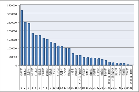 2016年1-9月各?。▍^(qū)、市)拍賣成交情況 1-9月,我國31個?。▍^(qū)、市)拍賣成交額超過200億的有3個?。▍^(qū)、市),分別是浙江省、山東省、上海市(見圖3)。3個?。▍^(qū)、市)共計(jì)成交809.83億元,占上半年全行業(yè)拍賣成交額的28.37%。 拍賣成交額在100-200億區(qū)間的有9個?。▍^(qū)、市),分別有河北省、廣東省、福建省、四川市、海南省、安徽省、北京市、江蘇省和天津市,3個省(區(qū)、市)共計(jì)成交1323.96億元,占上半年全行業(yè)拍賣成交額的46.38%。 拍賣成交額在20-100億區(qū)間的有12個?。▍^(qū)、市),分別是遼寧省、湖北省、甘肅省、湖南省、廣西區(qū)自治區(qū)、內(nèi)蒙古、重慶市、山西省、河南省、江西省、云南省和陜西省,12個?。▍^(qū)、市)共計(jì)成交651.93億元,占上半年全行業(yè)拍賣成交額的22.84%。 拍賣成交額在1-20億元的有7個?。▍^(qū)、市),分別是寧夏自治區(qū)、新疆自治區(qū)、貴州省、黑龍江省、吉林省、青海省和西藏自治區(qū)。 ![]() 圖3 2016年1-9月各?。▍^(qū)、市)拍賣成交情況 |